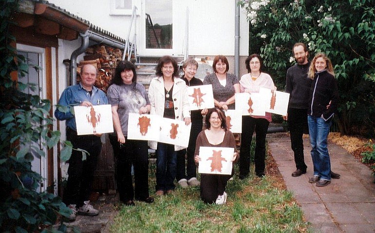 "Totale Begeisterung in Förtha"Teilnehmer des Geisterworkshops in Förtha mit einer Klecksographie in den Händen