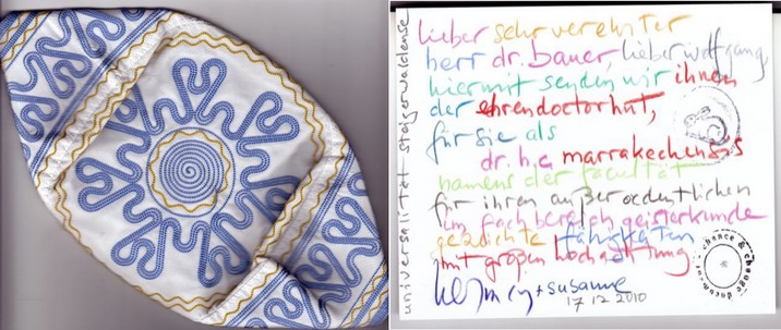 Der Künstler und Botaniker Herman de Vries, der an dem Workshop im Cafe Ton teilnahm, verlieh mir anschließend diesen hübschen Ehrendoktorhut, den er in Marrakesch einmal erworben hatte.